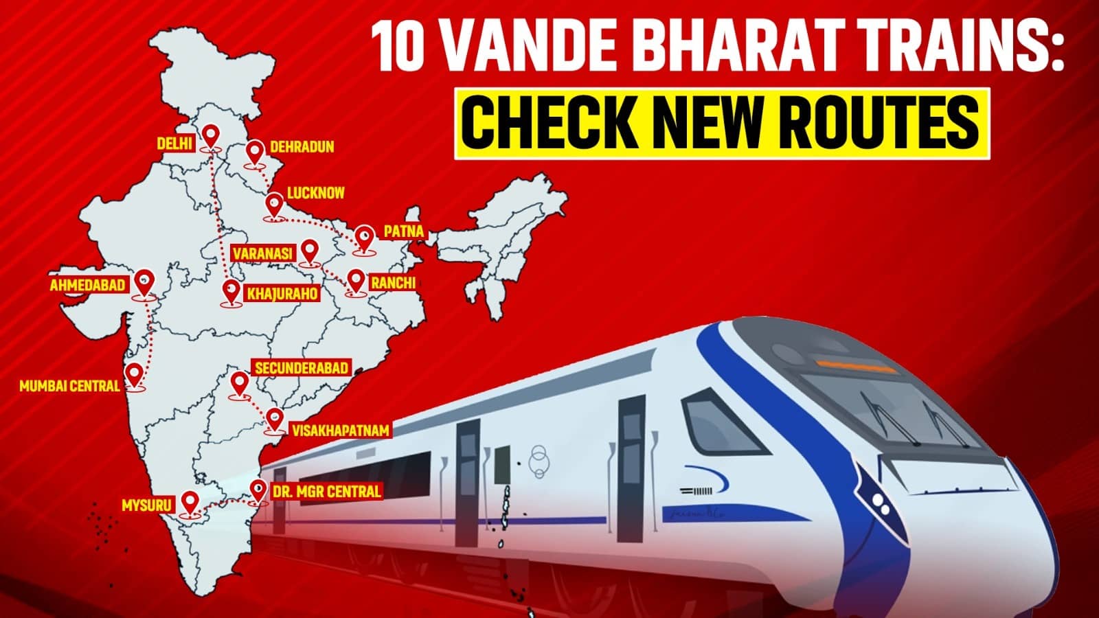 PM Modi greenlighted 10 new high-speed trains between Ahmedabad-Mumbai Central, Secunderabad-Visakhapatnam, Mysuru-Dr MGR Central (Chennai), Patna- Lucknow, New Jalpaiguri-Patna, Puri-Visakhapatnam, Lucknow-Dehradun, Kalaburagi–Sir M Visvesvaraya Terminal Bengaluru, Ranchi-Varanasi, Khajuraho-Delhi (Nizamuddin).