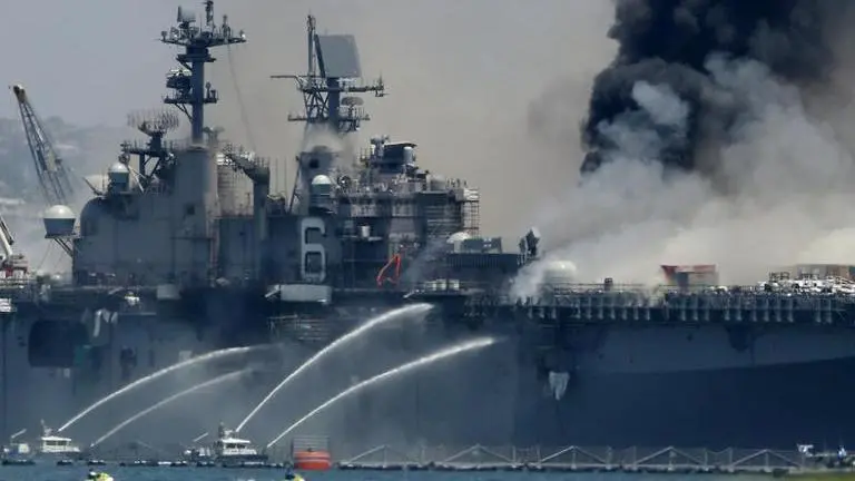 The cause of the fire was under investigation. It wasn't immediately known where on the 840-foot (255-meter) amphibious assault vessel the blast and the fire occurred. The flames sent up a huge plume of dark smoke visible around San Diego.