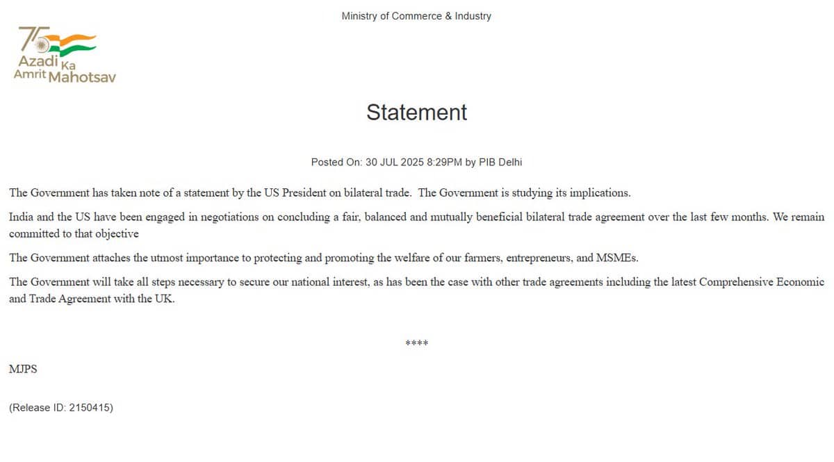 "India and the US have been engaged in negotiations on concluding a fair, balanced and mutually beneficial bilateral trade agreement over the last few months. We remain committed to that objective. The Government attaches the utmost importance to protecting and promoting the welfare of our farmers, entrepreneurs, and MSMEs. The Government will take all steps necessary to secure our national interest, as has been the case with other trade agreements including the latest Comprehensive Economic and Trade Agreement with the UK."