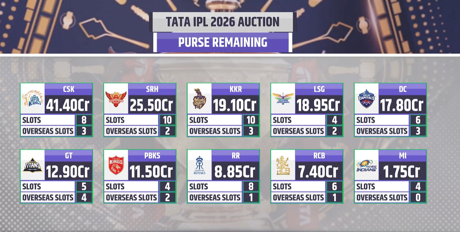 IPL 2026 Auction Live: Here's the remaining purse for all the ten teams