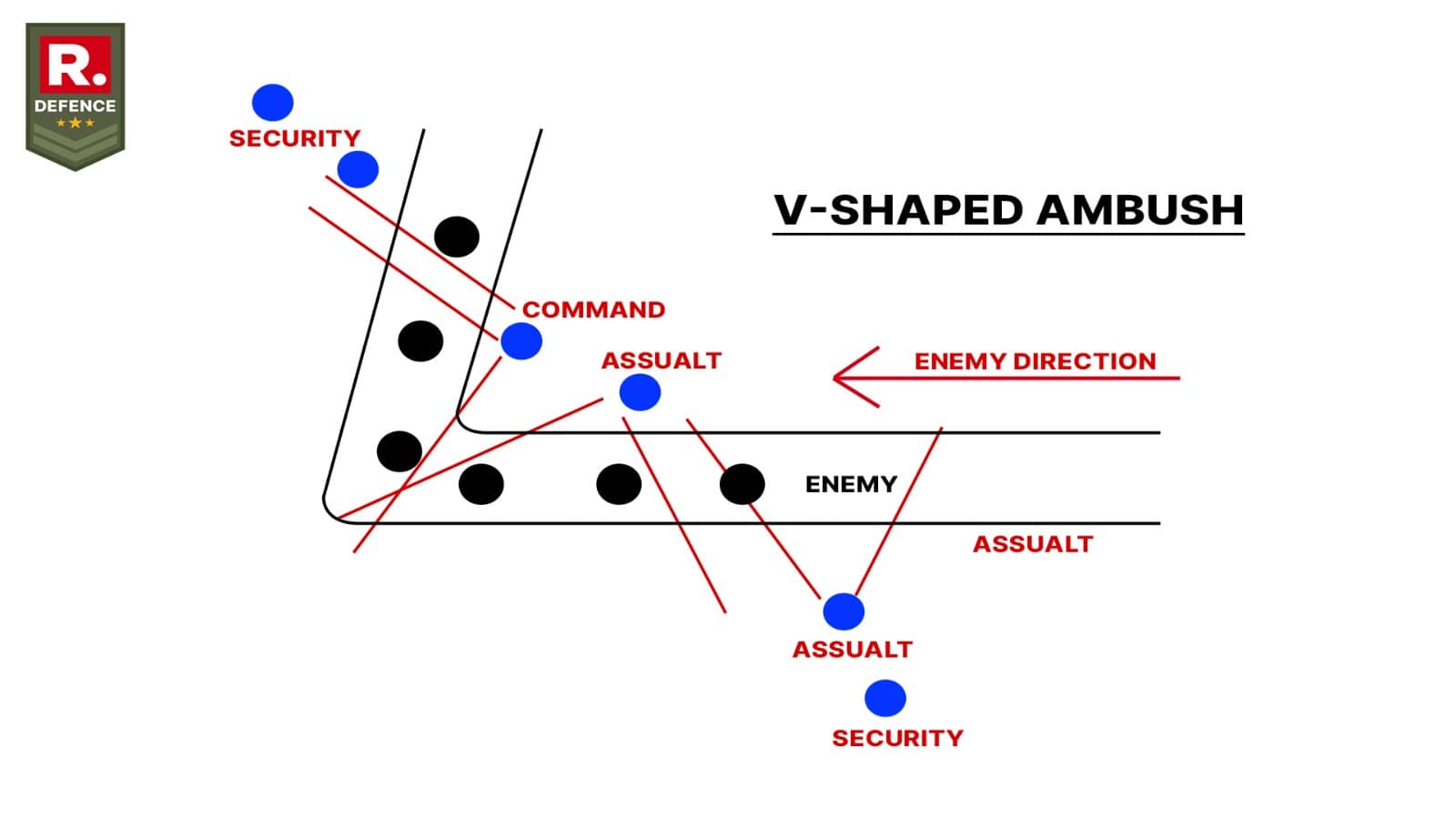 V-shaped ambushes are highly effective in trapping and neutralizing adversaries. Such an ambush creates a lethal crossfire at the apex.