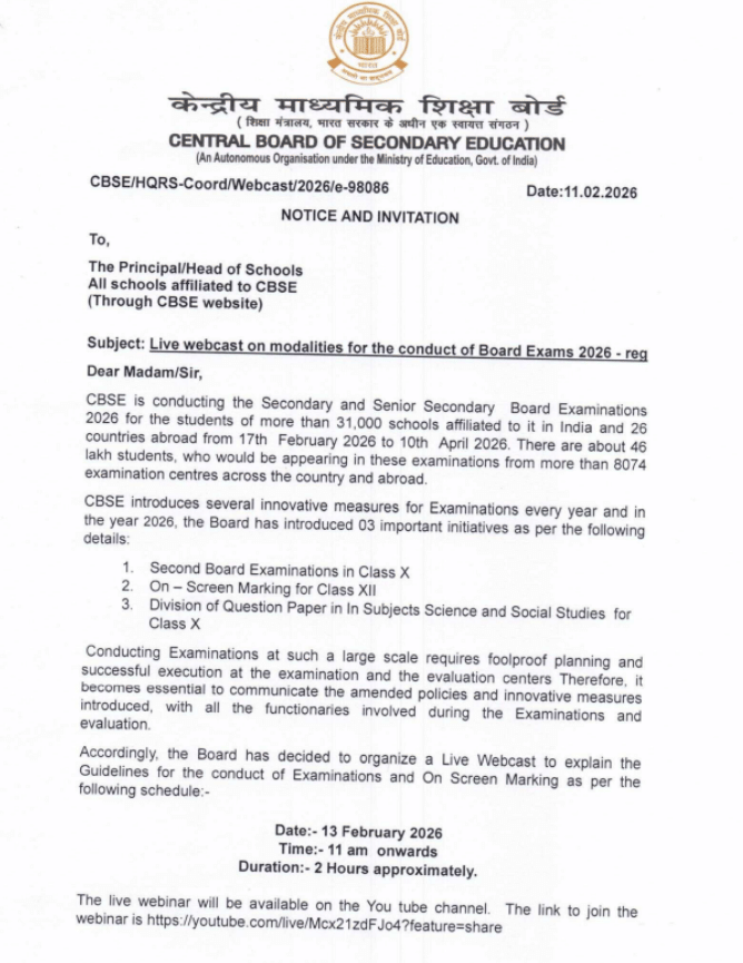 The Central Board of Secondary Education (CBSE) is hosting a live webcast on 13 February 2026 around 11 AM IST for about two hours to explain the modalities of the CBSE Board Exams 2026.