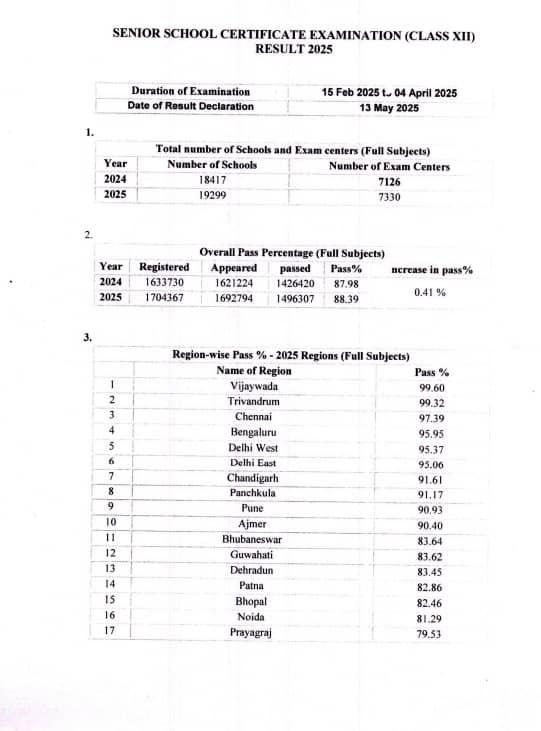 In the CBSE Class 12 results, the Vijayawada region recorded the highest pass percentage at 99.60%, followed by Trivandrum at 99.32% and Chennai at 97.39%, reflecting strong academic performance across these regions.