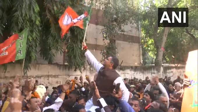 BJP leader Ramesh Pokhriyal Nishank says, "The people of Delhi are celebrating Diwali and Holi together...The public of Delhi is getting freedom from 10 years of hell and they have bestowed their trust on PM Modi...As PM Modi said we will work to make Delhi the 'Viksit Capital' of 'Viksit Bharat'...