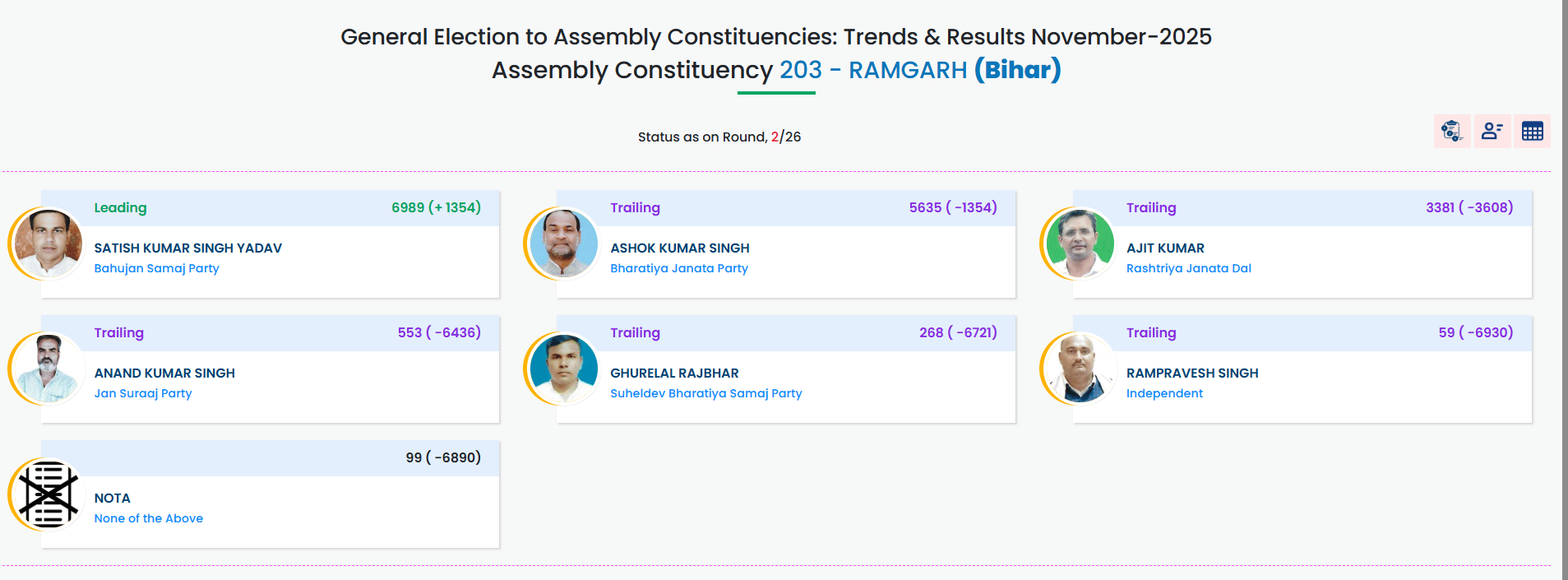 Kaimur Election Result 2025 LIVE: Bahujan Samaj Party now leads by 6989 votes from Ramgarh seat.