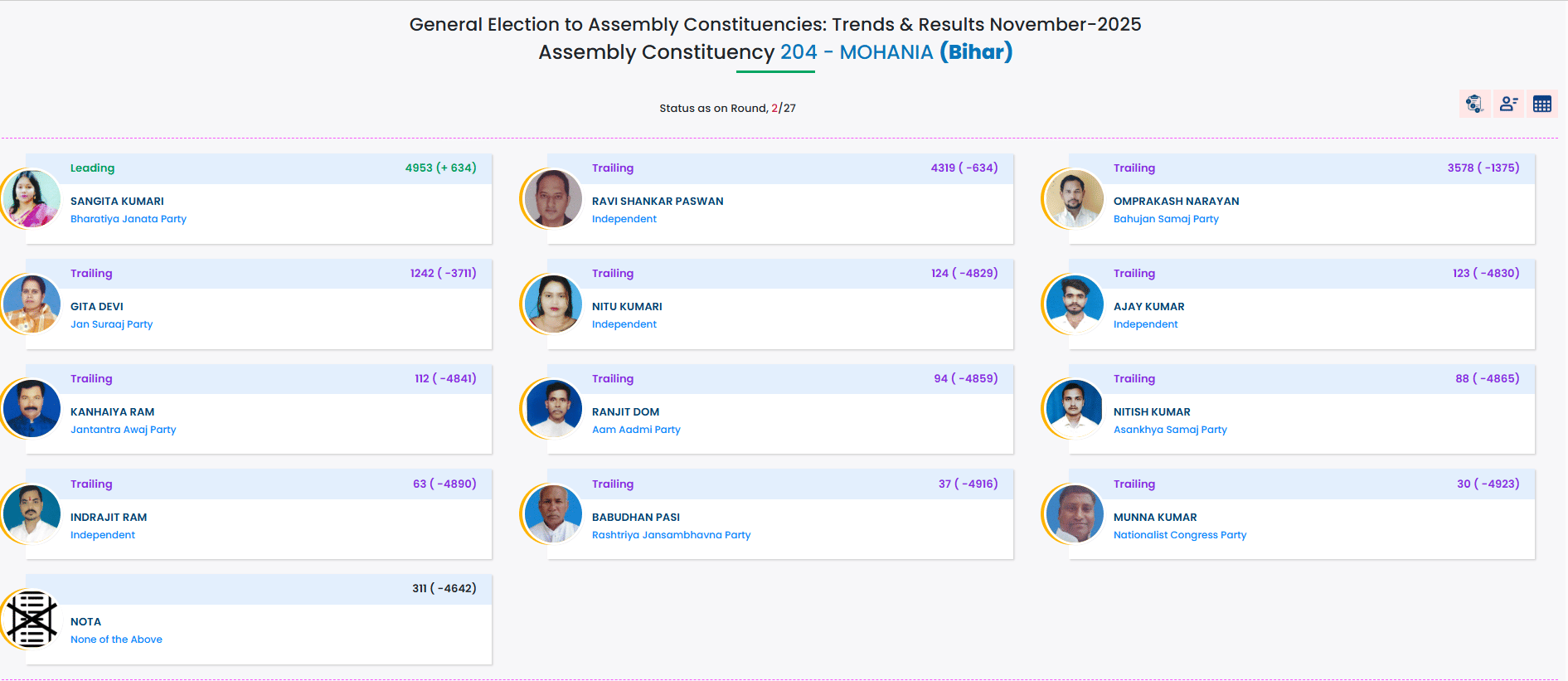 Kaimur Election Result 2025 LIVE: BJP candidate Sangita Kumari is now leading from Mohania.