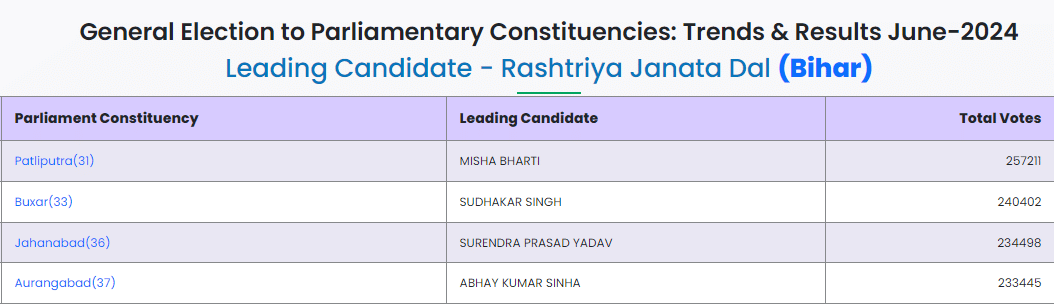 Bihar Election Result 2024 LIVE: RJD candidate Misa Bharti from Pataliputra and Nityanand Rai From Ujiarpur are trailing behind, according to the election commission data.