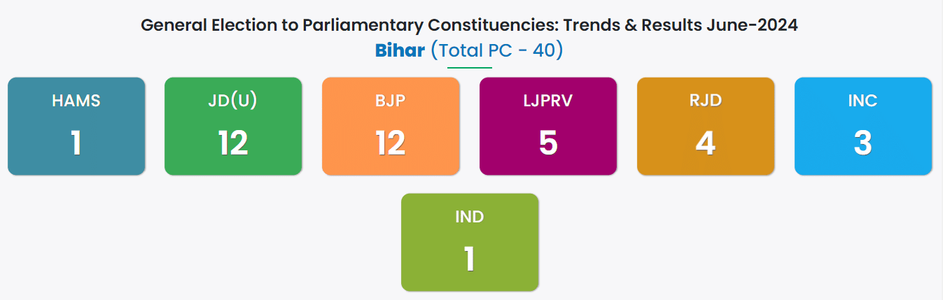 In the 2019 Lok Sabha elections held in Bihar, the BJP-led NDA swept through the state with BJP winning 17 and JDU 16 seats. Another NDA alliance partner—LJP bagged 6 seats, while the Congress-led opposition claimed just one seat- Kishanganj.
