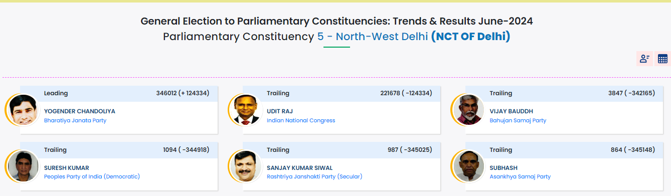 BJP's North-West Delhi candidate Yogender Chandoliya is the best performing candidate of the party in the national capital and is leading by was leading by 1,24,334 votes against the Congress' Udit Raj, the Election Commission data showed.
