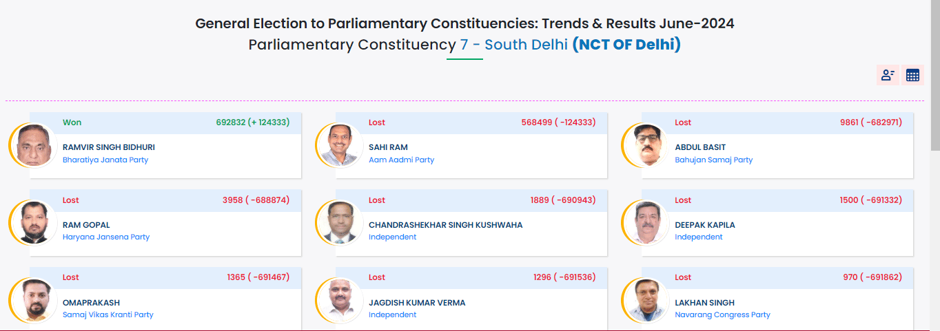 BJP's Ramvir Singh Bidhuri won the South Delhi seat, defeating AAP's Sahi Ram Pahalwan by a margin of 1,24,333 votes. Bidhuri is the leader of opposition in the Delhi Assembly.