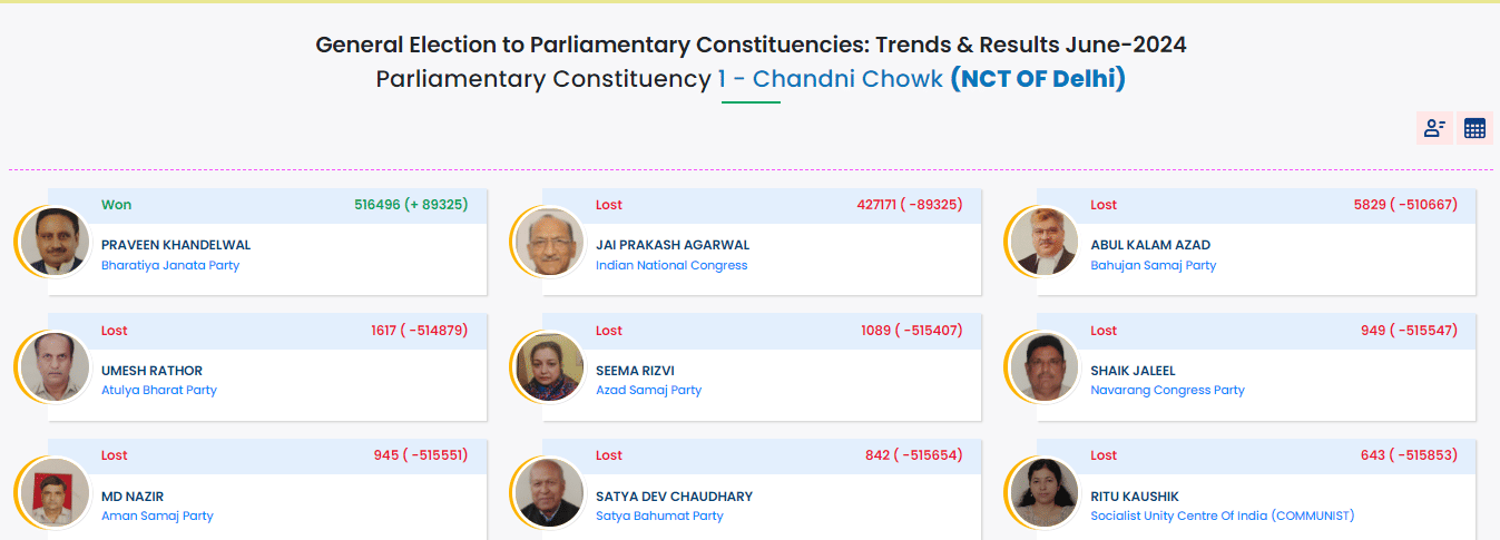 BJP candidate from Delhi's Chandni Chowk Lok Sabha seat Praveen Khandelwal defeated Congress veteran J P Agarwal by a margin of 89,325 votes. Khandelwal, a first-timer, was trailing Agarwal in the initial rounds. He secured a lead later and went on to win the seat.