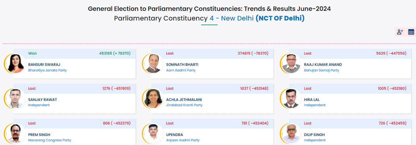 BJP's Bansuri Swaraj wins New Delhi seat, defeats AAP's Somnath Bharti by margin of over 78,000 votes, said data from Election Commission.
