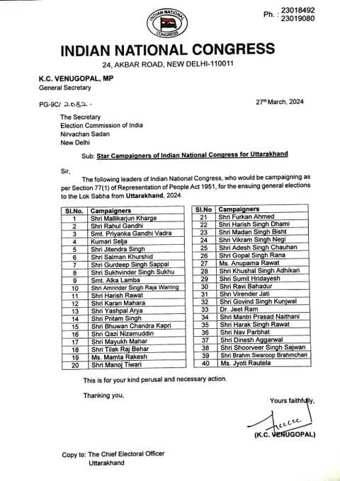 Congress releases a list of 40 star campaigners for Uttarakhand for the upcoming Lok Sabha Elections 2024. Leaders including Mallikarjun Kharge, Rahul Gandhi and Priyanka Gandhi Vadra are among the campaigners. Here is the full list:
