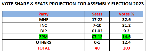 Matrize’s exit poll shows clear win for Chief Minister Zoramthanga’s Mizo National Front (MNF) in Mizoram. The MNF is predicted to get 17-22 seats, the Congress 7-10 seats, and the BJP 01-02, while ZPM may land 07-12 seats.