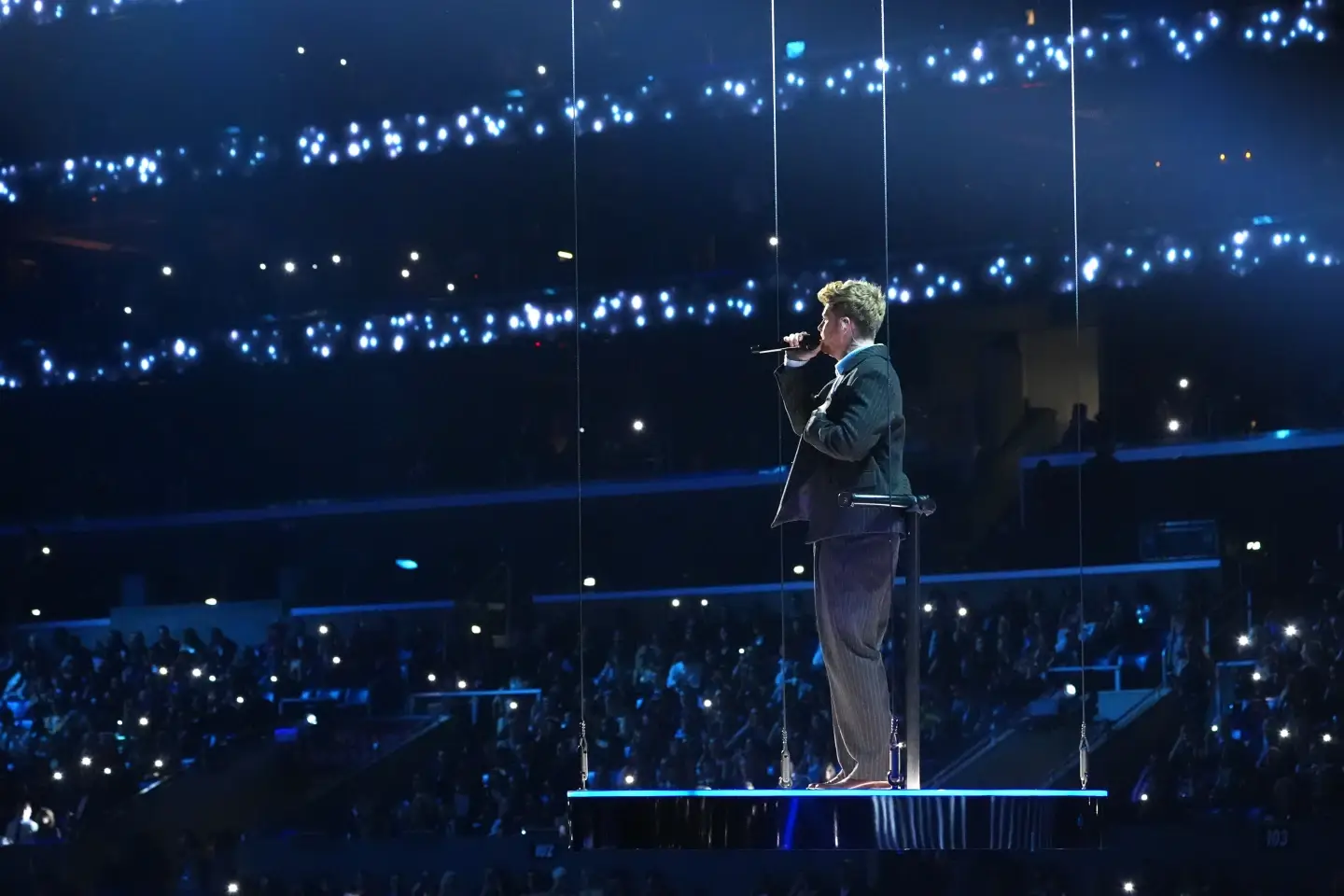 Wearing what appears to be a wicker lampshade, Lady Gaga performs the rock version of Abracadabra, but there’s so much smoke it’s impossible to get a clear view of her inside the arena, and she’s not close to the edge of the stage. The camera is blocking the crowd from seeing much of it.