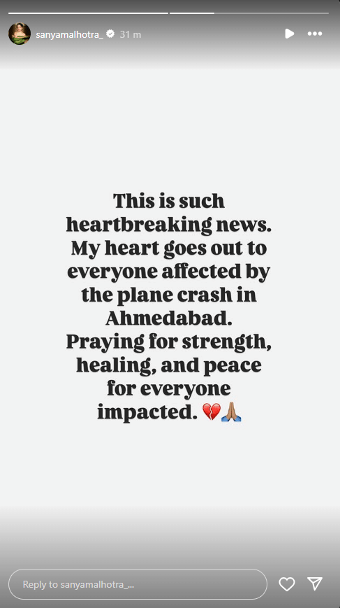 Sanya Malhotra has joined the list of celebs expressing grief over the tragic plane crash in Ahmedabad. “This is such heartbreaking news. My heart goes out to everyone affected by the plane crash in Ahmedabad. Praying for strength, healing, and peace for everyone impacted,” read her Instagram post.