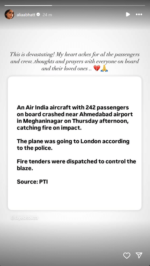 Alia Bhatt calls the Air India plane crash incident “devastating”. Taking to her Instagram Stories, she re-shared a news clip and wrote, “This is devastating! My heart aches for all the passengers and crew… thoughts and prayers with everyone on board and their loved ones…”