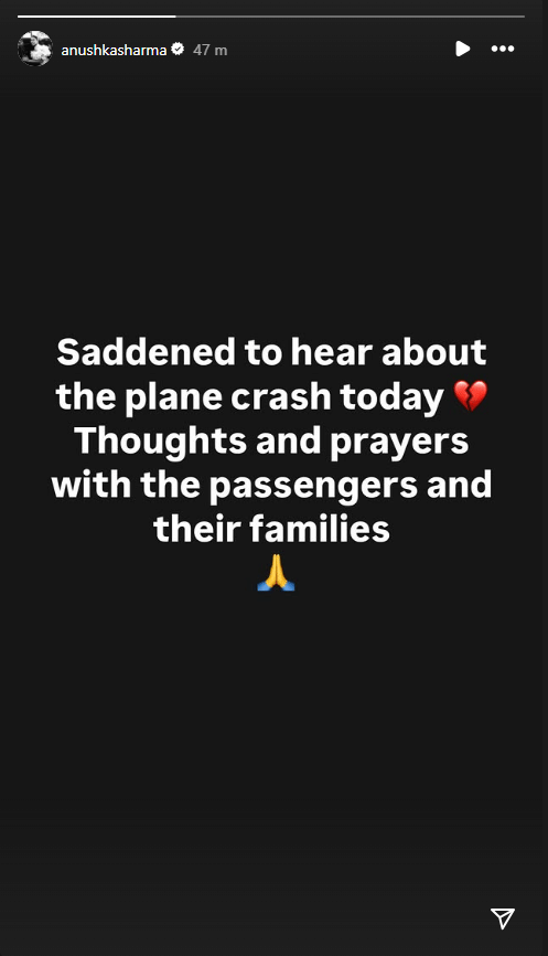 Anushka Sharma took to her Instagram stories to express her sadness over the news of a plane crash in Ahmedabad, which was carrying over 200 passengers. She wrote, “Saddened to hear about the plane crash today. Thoughts and prayers with the passengers and their families.”