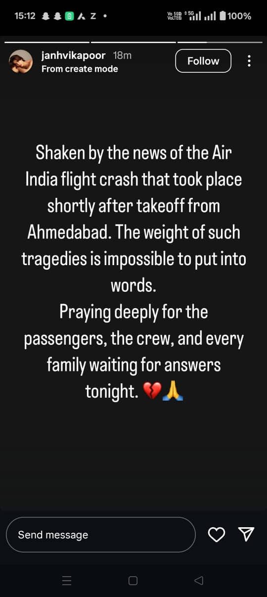 Janhvi Kapoor penned a heartfelt note praying for the passengers, the crew and their family members after hearing about the Air India plane crash in Ahmedabad. “Shaken by the news of the Air India flight crash that took place shortly after takeoff from Ahmedabad. The weight of such tragedies is impossible to put into words. Praying deeply for the passengers, the crew, and every family waiting for answers tonight.”