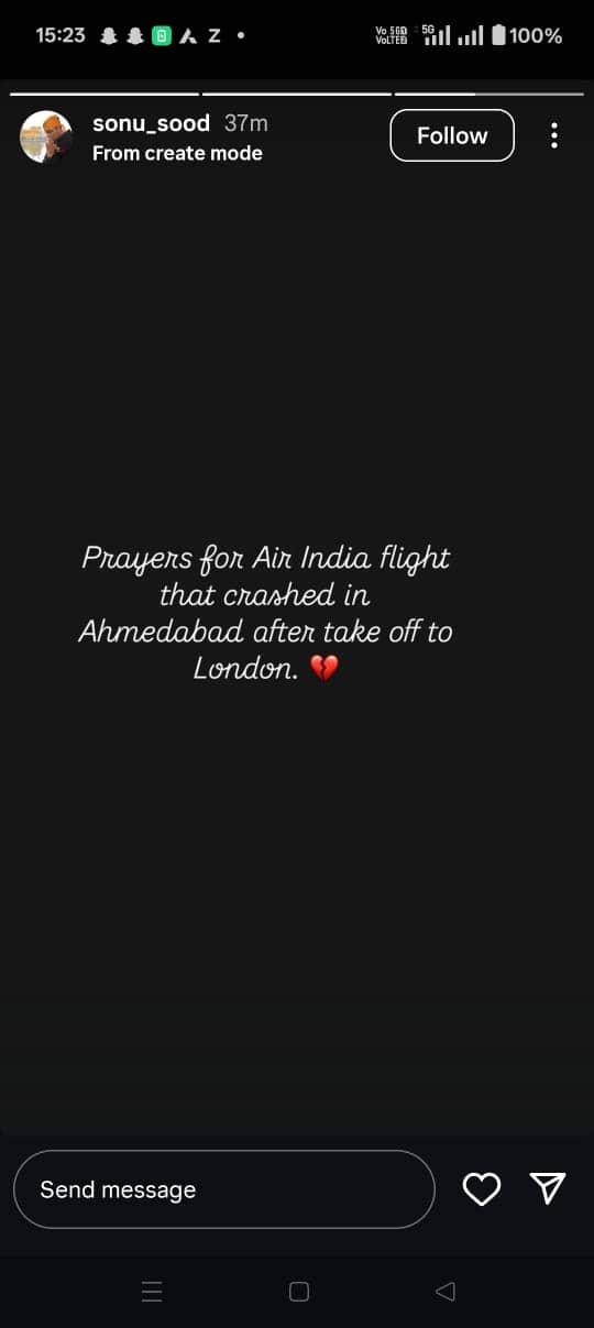 Sonu Sood took to his Instagram Stories and expressed grief over the plane crash and sent prayers for all the passengers. “Prayers for the Air India flight that crashed in Ahmedabad after takeoff to London,” read his note.