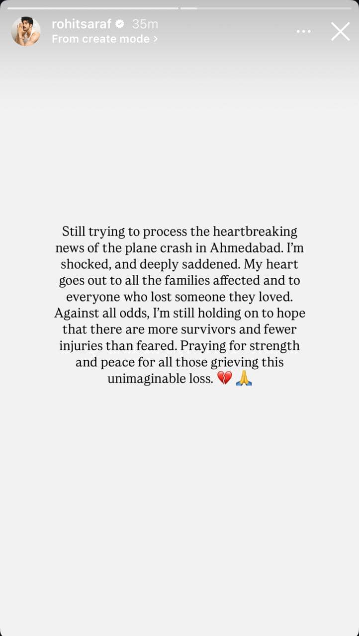 Sky Is Pink actor Rohit Saraf penned a heartfelt note on his Instagram Stories expressing shock and hoping for survivors. “Still trying to process the heartbreaking news of the plane crash in Ahmedabad. I'm shocked, and deeply saddened. My heart goes out to all the families affected and to everyone who lost someone they loved. Against all odds, I'm still holding on to hope that there are more survivors and fewer injuries than feared. Praying for strength and peace for all those grieving this unimaginable loss,” he wrote.
