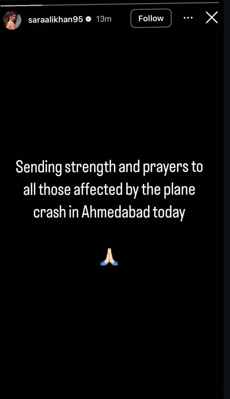 Sara Ali Khan is the new celeb to react to the plane crash incident. She took to her Instagram stories and wrote, “Sending strength and prayers to all those affected by the plane crash in Ahmedabad today.”