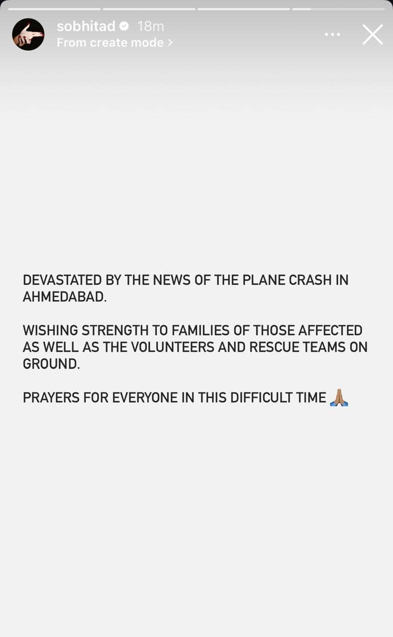 Sobhita Dhulipala took to her Instagram Stories and wrote, “Devastated by the news of the plane crash in Ahmedabad. Wishing strength to families of those affected, as well as the volunteers and rescue teams on the ground. Prayers for everyone in this difficult time.”
