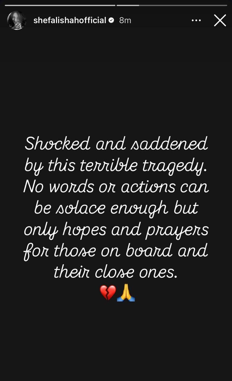 Shefali Shah, on the other hand, wrote, “Shocked and saddened by this terrible tragedy. No words or actions can be solace enough but only hopes and prayers for those on board and their close ones.”
