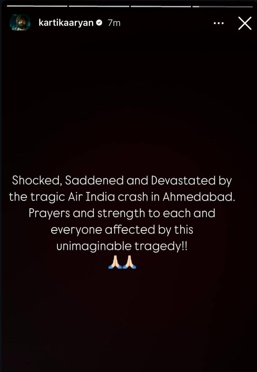 Kartik Aaryan, who is currently shooting with Ananya Panday for their upcoming rom-com drama Tu Meri Main Tera Main Tera Tu Meri, penned a heartfelt note expressing shock. He wrote, “Shocked, Saddened and Devastated by the tragic Air India crash in Ahmedabad. Prayers and strength to each and every one affected by this unimaginable tragedy!!”