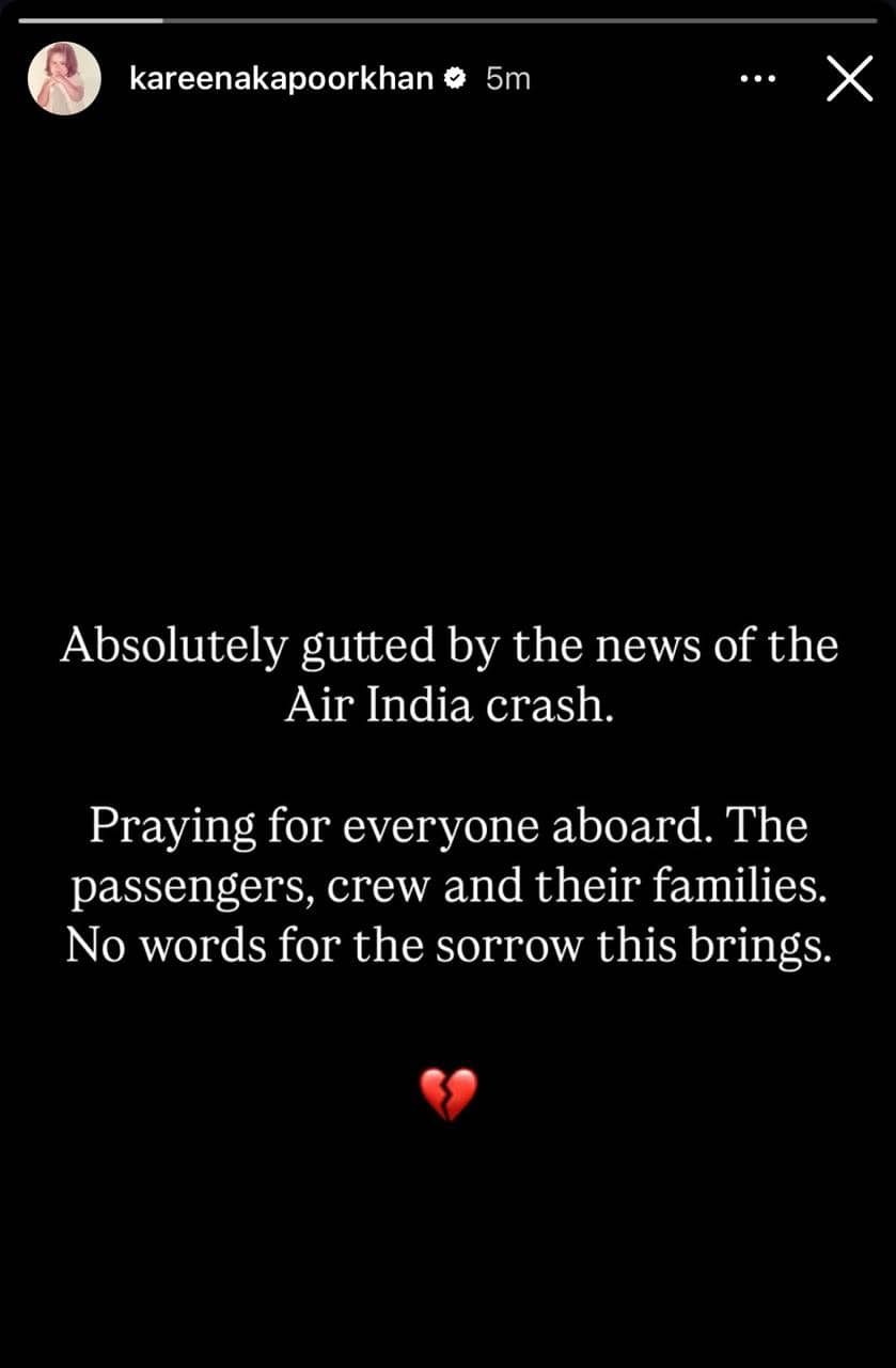Kareena Kapoor took to her Instagram stories and wrote, “Absolutely gutted by the news of the Air India crash. Praying for everyone aboard. The passengers, crew and their families. No words for the sorrow this brings.”