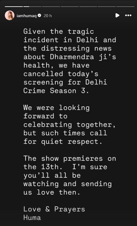 On Tuesday, Huma Qureshi took to her social media handle to inform her fans that the makers of Delhi Crime Season 3 have decided to cancel the screening of the show due to a blast in Delhi's Red Fort area and the deteriorating health of Dharmendra. Taking to her Instagram Stories, she wrote, “Given the tragic incident in Delhi and the distressing news about Dharmendra ji’s health, we have cancelled today’s screening for Delhi Crime Season 3. We were looking forward to celebrating together, but such times call for quiet respect. The show premieres on the 13th. I'm sure you'll all be watching and sending us love then."