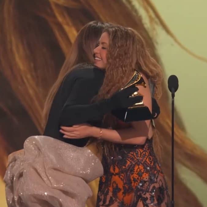Shakira won Best Latin Pop Album for Las Mujeres Ya No Lloran. Upon being announced a winner by Jennifer Lopez, her sons, Milan and Sasha, immediately hugged the singer. Accepting the award she said, “This is incredible, thank you so much. I want to share this award with my kids. I’m so proud of you guys, and of your kind hearts. Thank you so much for supporting me the way you do. I love you.””