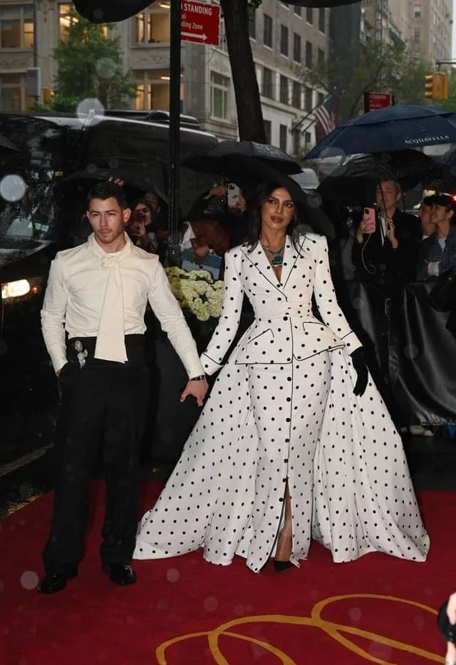 Priyanka Chopra and Nick Jonas exuded power couple vibes on the red carpet. The actress donned a white and black coloured polka dot outfit teamed with a statement Bvlgari necklace. Her husband, Nick Jonas, looked dapper in an off-white shirt teamed with loose-fitting pants.