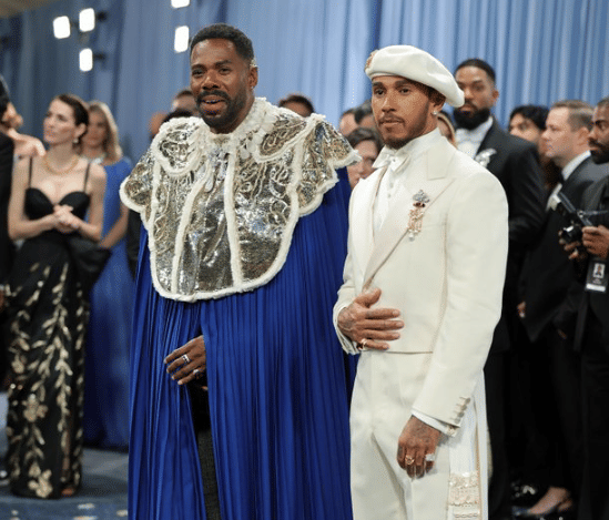 Lewis Hamilton looked dapper in a cream coloured suit while Colman Domingo stunned in a blue cape embellished with white and golden detailing on the neck.
