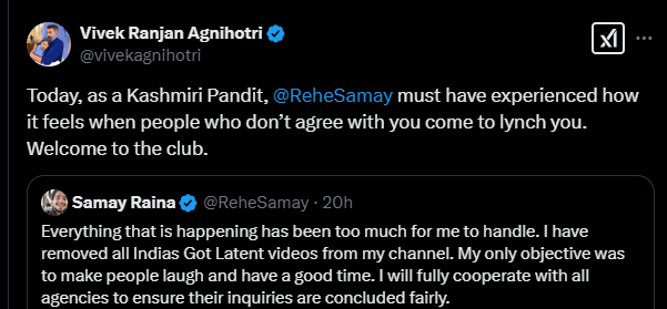 Veteran filmmaker Vivek Agnihotri reacted to Samay Raina and Ranveer Allahbadia’s controversy, which landed them in legal trouble. He reshared Comedian's statement on his X handle and cracked a joke about Samay being a Kashmiri Pandit. He wrote, “Today, as a Kashmiri Pandit, @ReheSamay must have experienced how it feels when people who don’t agree with you come to lynch you. Welcome to the club."