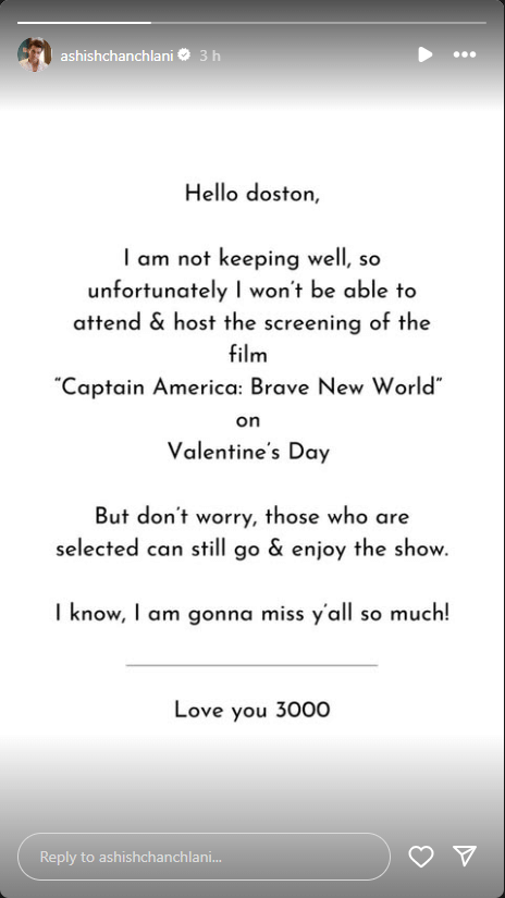 Amid the ongoing controversy surrounding Ranveer Allahbadia and India's Got Latent, YouTuber Ashish Chanchlani has announced that he will not be hosting Captain America: Brave New World event. It was scheduled for Valentine's Day, February 14. Taking to his Instagram Stories, Ashish shared a post where he revealed his decision to not host the show and cited the reason that he is unwell. He wrote, "Hello Doston, I am not keeping well, so unfortunately, I won't be able to attend and host the screening of the film Captain America: Brave New World on Valentine's Day. But don't worry, those who are selected can still go and enjoy the show. I know, I am gonna miss y'all so much! Love you 3000."