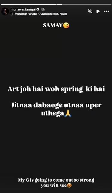 Taking to his Instagram handle, Munawar Faruqui shared a note in which he wrote, “Samay, art jo haina vo spring ki hai, jitnaa dabaoge utnaa uper uthega. My G is going to come out so strong you will see."