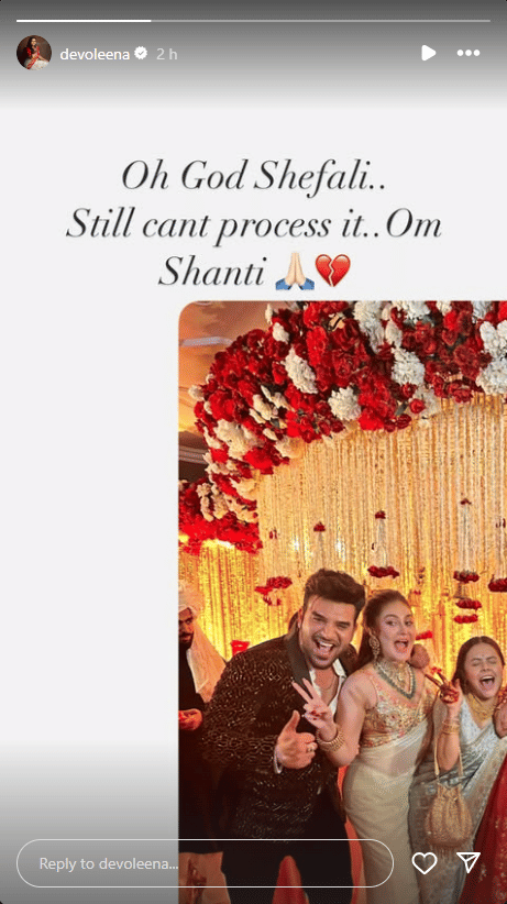 Taking to her Instagram stories, Devoleena Bhattacharjee shared a throwback photo with Shefali Jariwala from Durga Puja festivities. She shared the photo with the caption, “Oh God Shefali. Still can't process it. Om Shanti”.