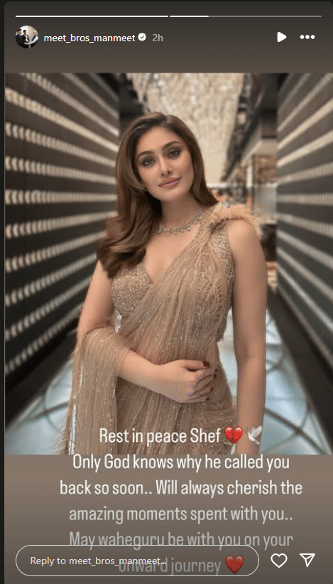 Manmeet Singh, Shefali Jariwala’s former brother-in-law, expressed his condolences. He took to his Instagram Stories and shared a photo of the actress and wrote, “Rest in peace Shef Only God knows why he called you back so soon.. Will always cherish the amazing moments spent with you.. May Waheguru be with you on your onward journey.” The Kaanta Laga girl was married to his brother, Harmeet Singh, in 2004, but they parted ways in 2009.
