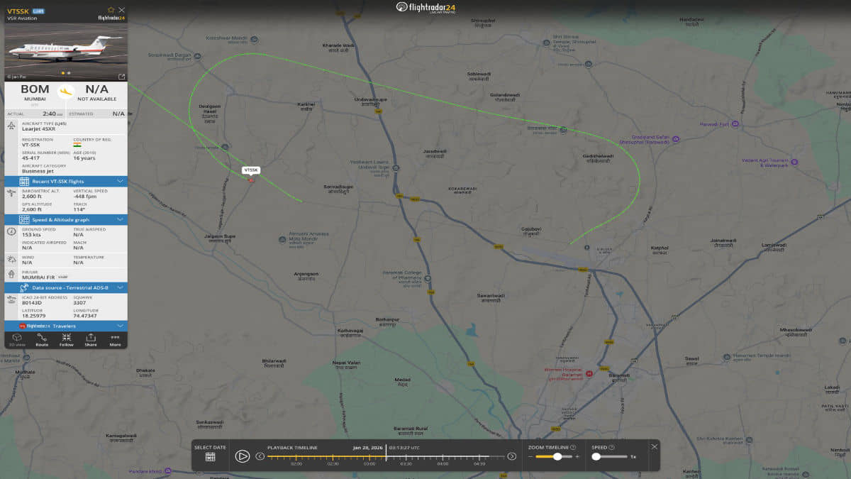 Baramati Plane Tragedy LIVE Updates: Flight data shows the aircraft took off from Mumbai at 8:10 am and remained airborne for about 35 minutes. The flight disappeared from radar at 8:45 am, indicating the moment of the crash. Data further reveals the plane made a loop around the runway and crashed 80-100 metres from the runway at Baramati airport.
