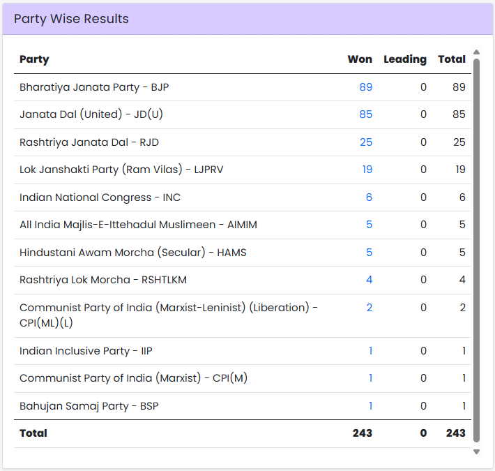 Bihar Election Results 2025 LIVE: NDA Continues Its Sweeping Lead As Top BJP-JD(U) Candidates Secure Strong Victories Across Key Seats
