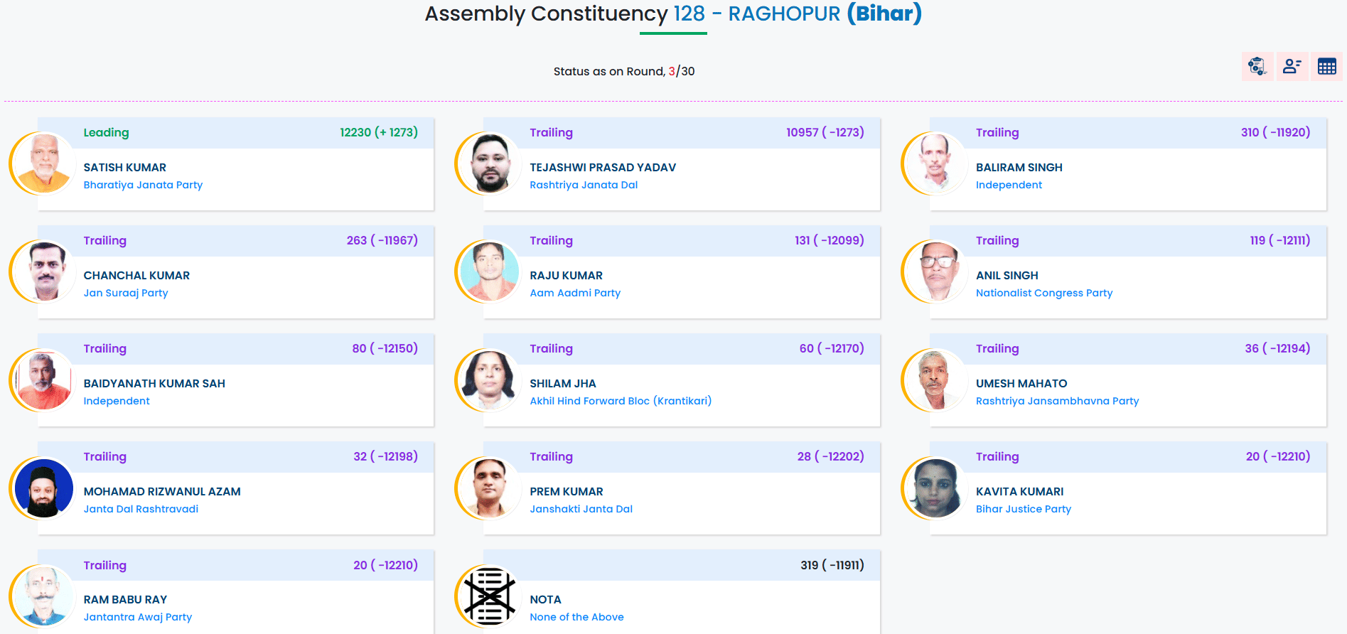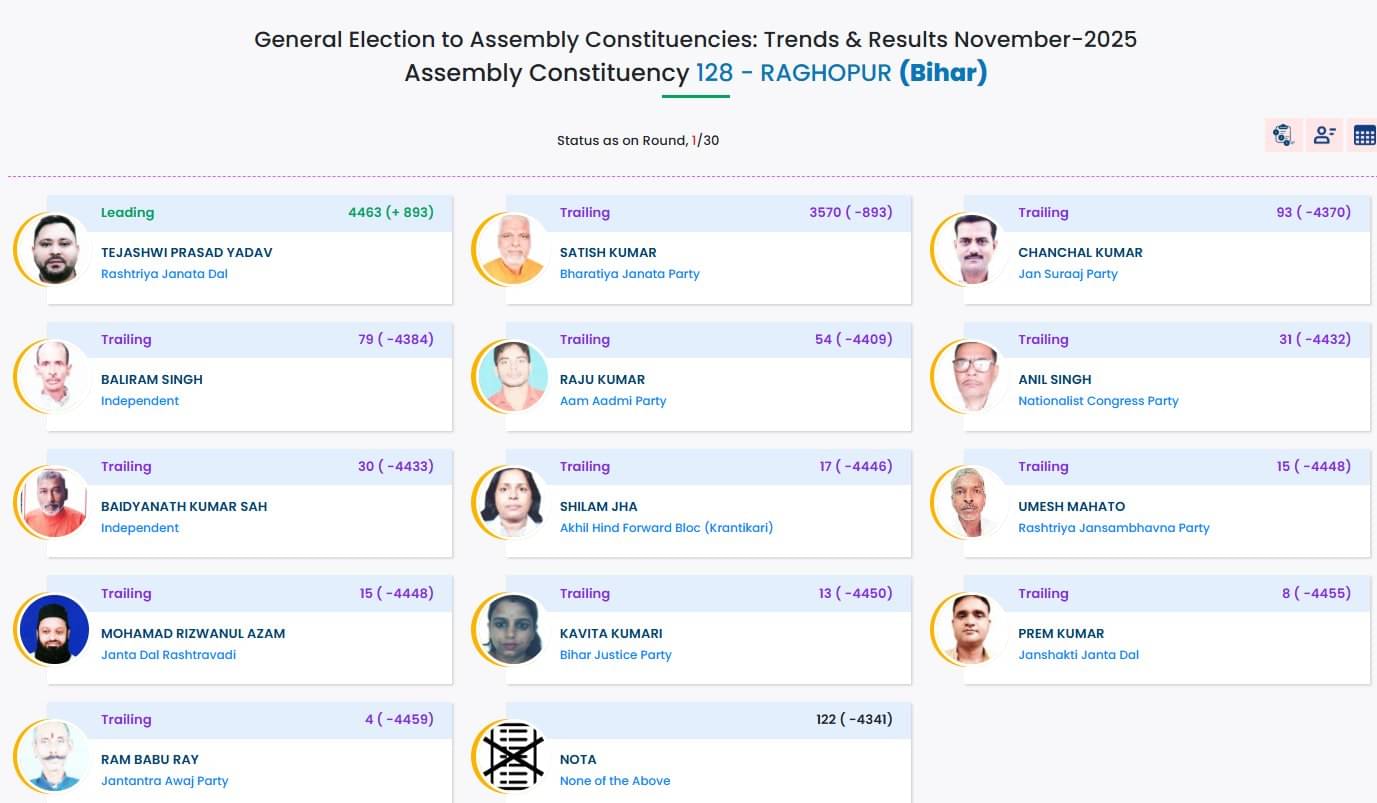 RJD’s Tejashwi leads from Raghopur by 893 votes after round 1/30 of counting