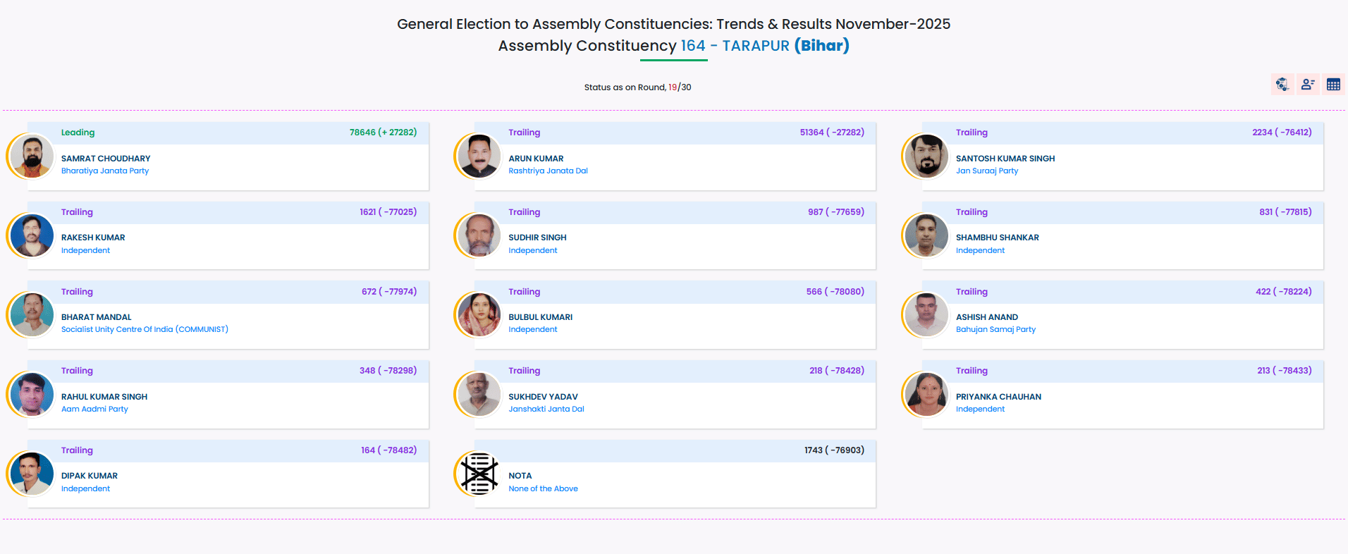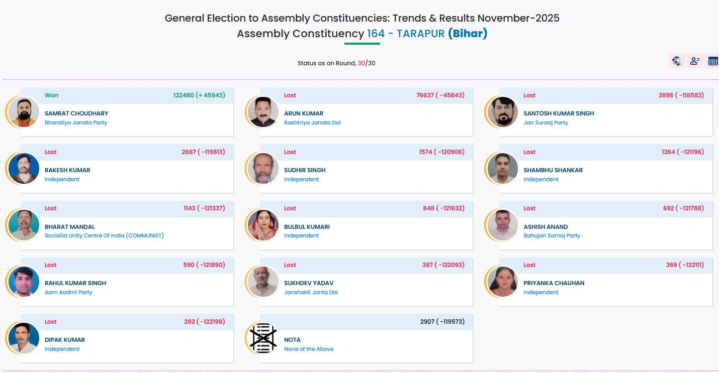 ECI Results Bihar Election 2025 Live Updates: BJP’s Samrat Choudhary Set To Win From Tarapur