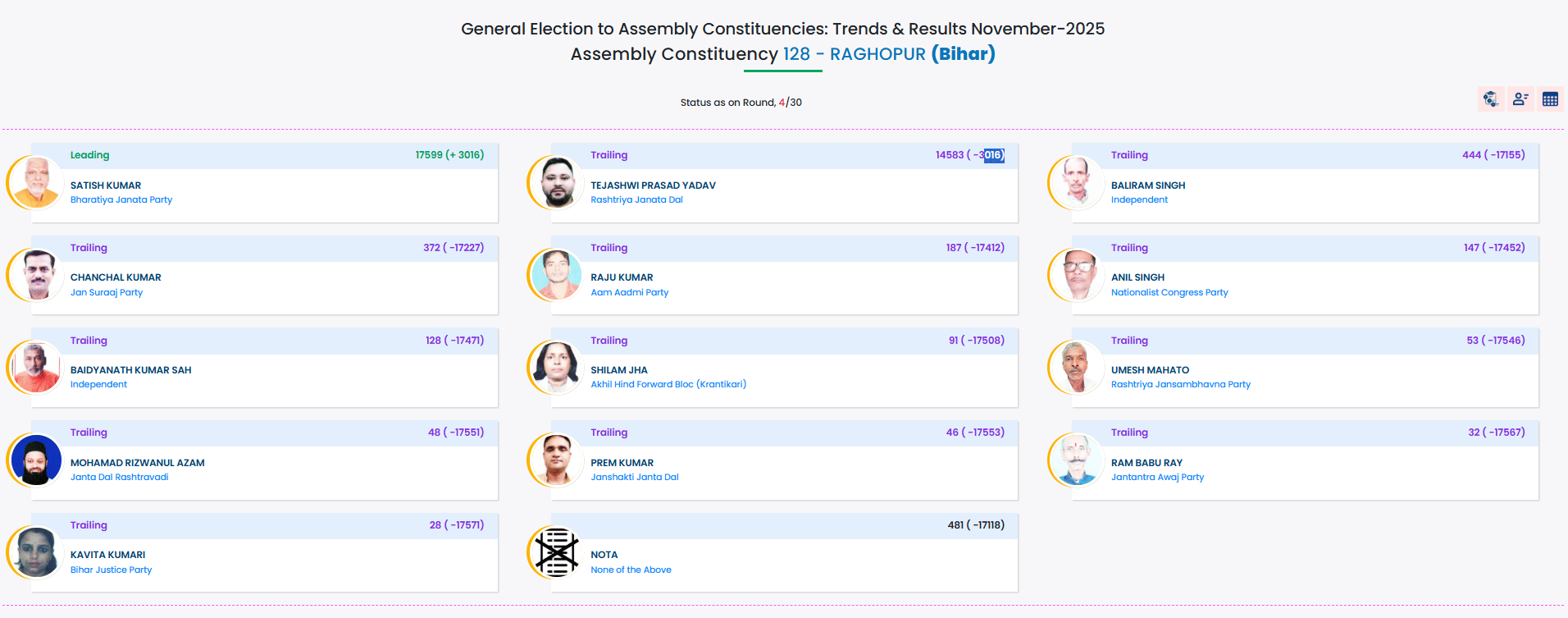 Bihar Election 2025 Result Live: Raghopur Rollercoaster: Tejashwi Regains Lead by 1,186 After Dramatic Back-and-Forth