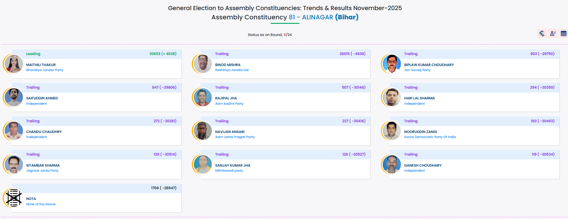 Folk singer and BJP candidate Maithili Thakur is leading from Alinagar constituency, while RJD’s Binod Mishra is trailing by 999 votes.