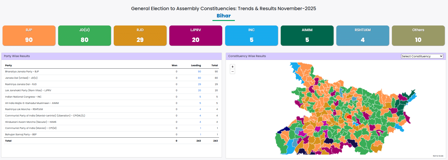The Bihar Legislative Assembly elections, held in two phases on November 6 and 11, 2025, saw a record voter turnout of 67.13% — the highest since 1951. Vote counting began at 8:00 AM today across 46 centres for all 243 seats. Early trends and leads have solidified into a resounding victory for the ruling National Democratic Alliance (NDA), led by Chief Minister Nitish Kumar's JD(U) and the BJP. The opposition Mahagathbandhan (RJD-Congress-Left alliance), spearheaded by Tejashwi Yadav, struggled significantly and fell to 35 seats, while Prashant Kishor's Jan Suraaj Party (JSP) has scored a duck. This marks Nitish Kumar's possible another term as the chief minister of Bihar.