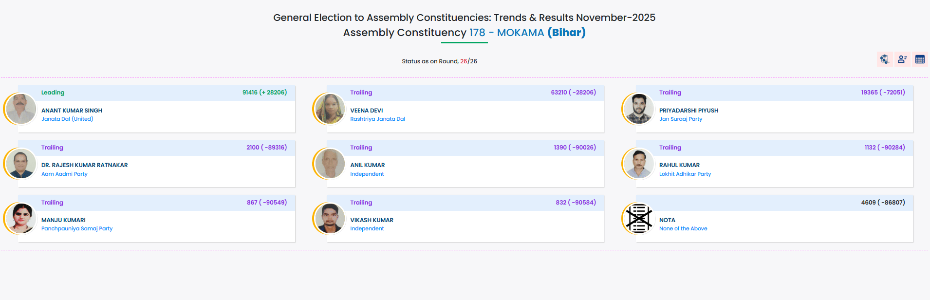 - Jailed JD(U) strongman Anant Singh defeats RJD's Veena Devi by 28,206 votes in Mokama.