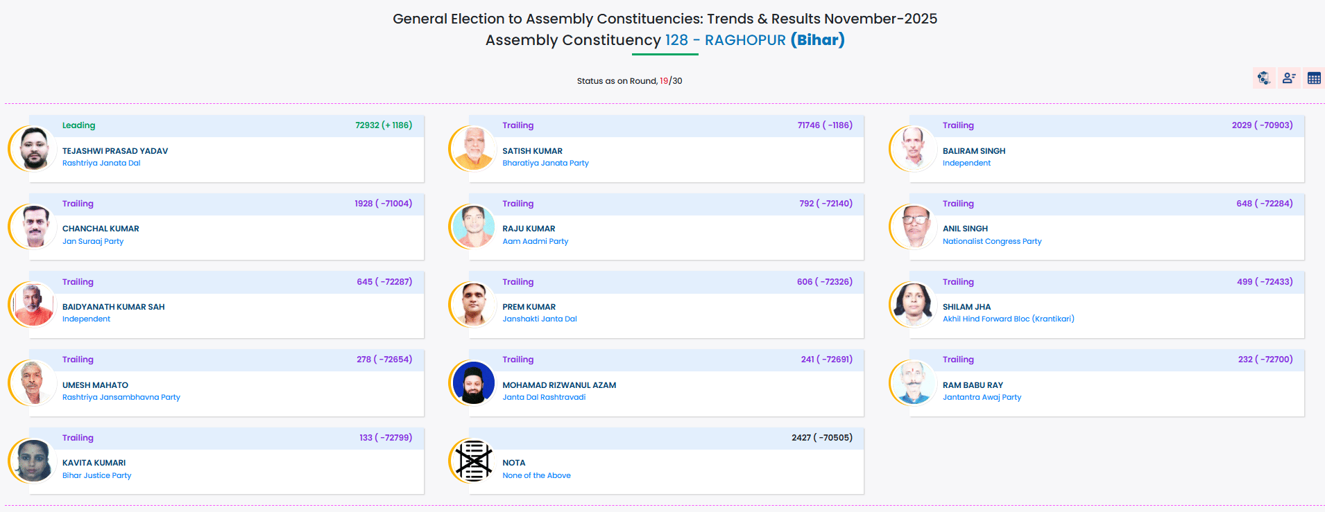 In one of Bihar’s most closely watched contests, Raghopur has turned into a political thriller. After repeatedly leading, trailing and reclaiming ground, RJD’s Tejashwi Yadav has finally regained the lead by 1,186 votes. The seat has seen constant fluctuations since morning, keeping both the RJD and NDA camps on edge as counting enters the decisive phases.