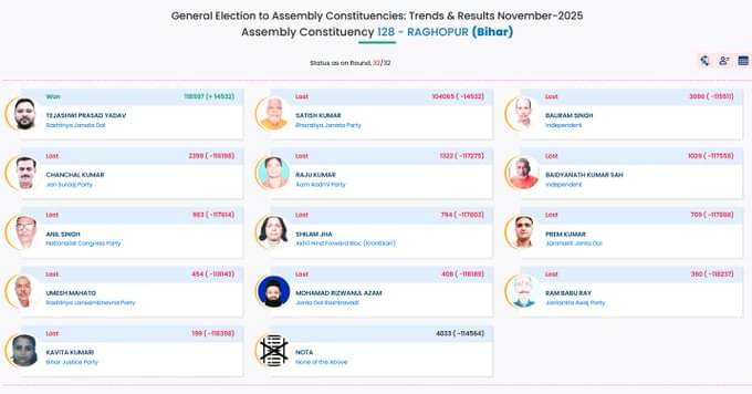 Bihar Election 2025 Result LIVE: Rashtraya Janata Dal's (RJD) Tejashwi Yadav won from the Raghopur Assembly seat by a margin of 14532 votes.