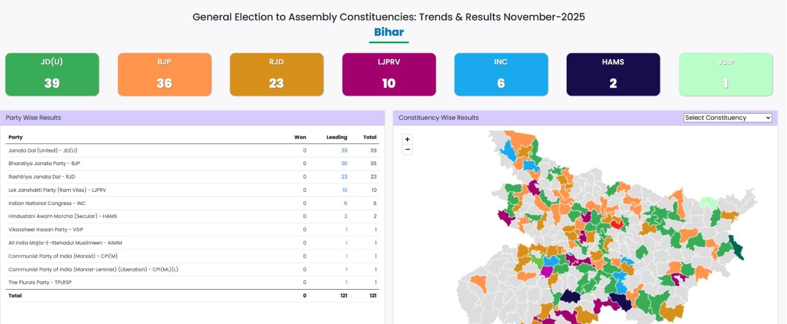 The Election Commission released early trends and results for the Bihar Assembly Elections 2025 with JDU leading in 39 seats, BJP in 36, RJD in 23 and Congress in six.